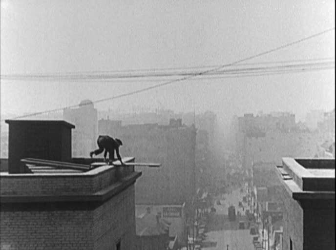 Der Kommentar berichtet von der filmhistorischen Bedeutung des Drehorts, besonders für »comedies which involved thrills«. Harald Lloyd habe hier gedreht, und viele andere, nun also auch Buster. Jetzt sieht man den atemberaubenden Sprung Busters. Den Sprung und den Fall.
