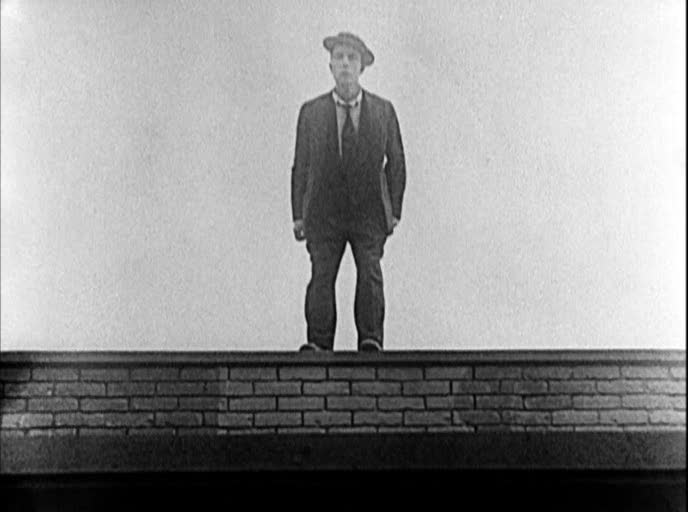 Das, was auf diese Sequenz folgt, sei inspiriert von einem Fehler. Man wisse nicht genau, was Buster Keaton sich dabei gedacht habe. Vermutlich dachte er, das Brett als Sprungbrett benutzen zu können, um von dem einem zum anderen Gebäude zu springen. »What else would he want to do?« Man wisse aus seinen anderen Filmen, dass er gut springen könne. Aber hier schafft er es nicht. Er kann sich nicht halten und er fällt. »It was a real fall. (…) He was injured. He was out of action for three days.«